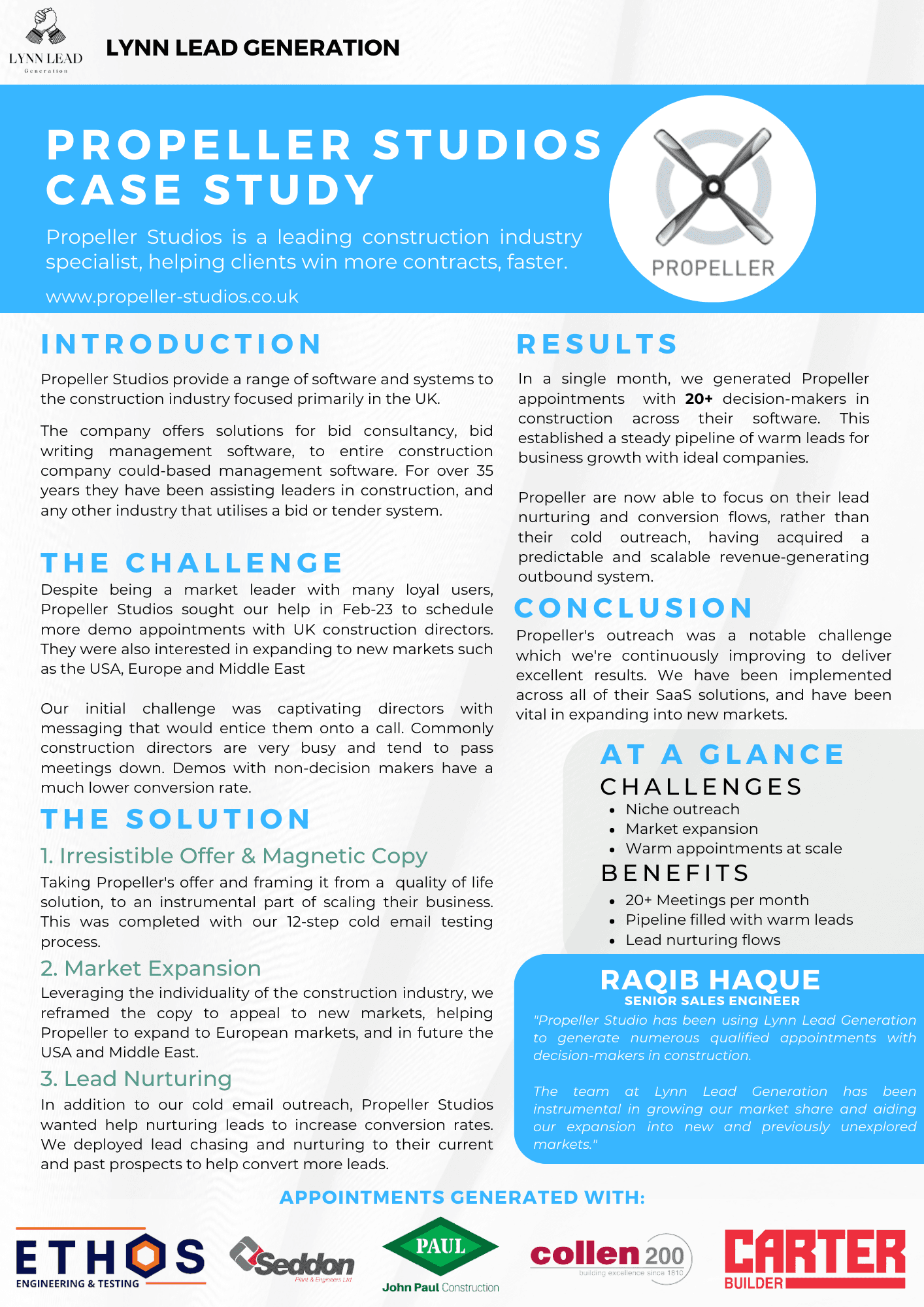Within a month, we secured over 20 appointments with key decision-makers in construction for Propeller, creating a steady pipeline of warm leads. This allowed them to shift focus from cold outreach to lead nurturing and conversion, thanks to a scalable outbound system that drives predictable revenue growth.