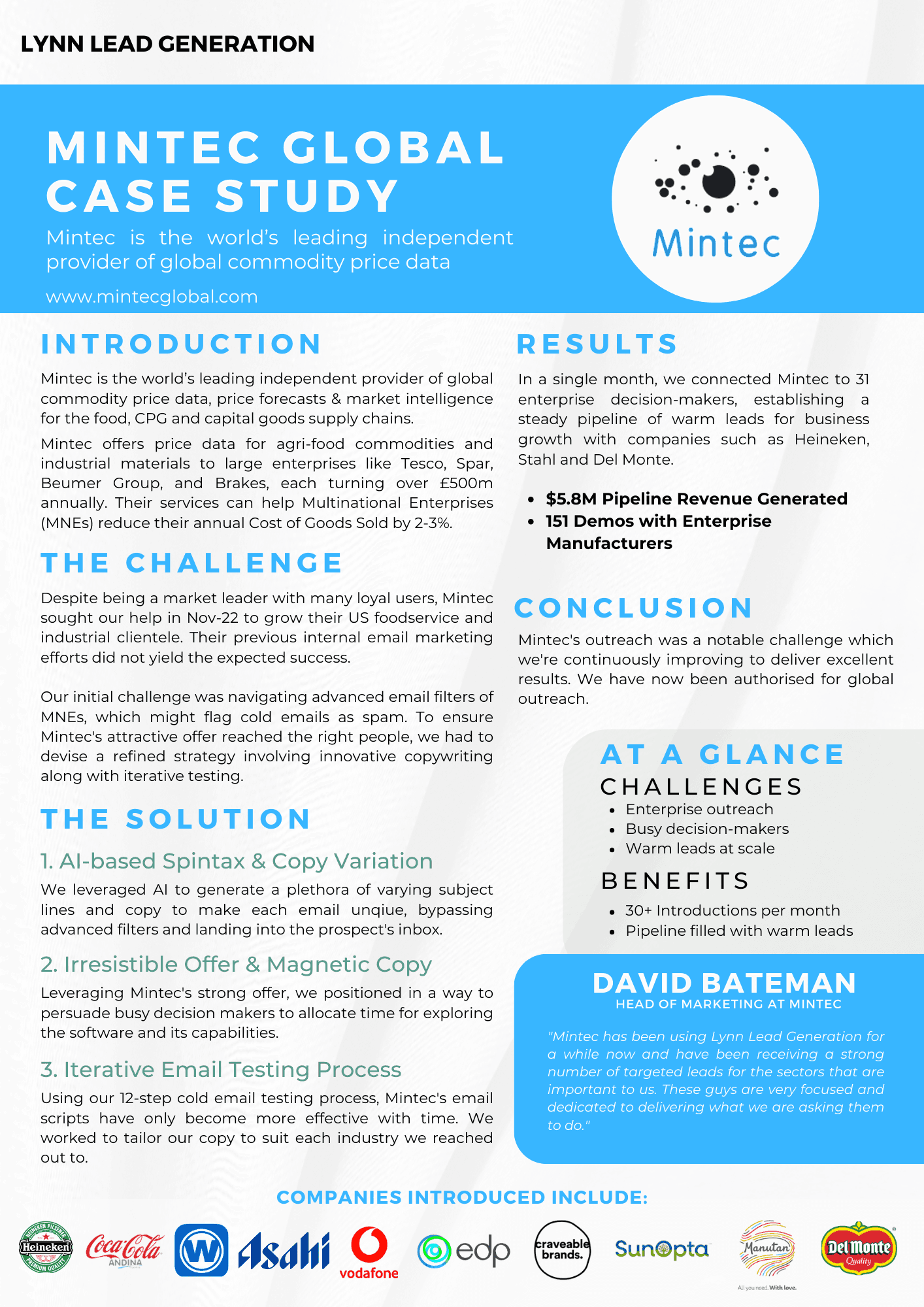 In a single month, we connected Mintec to 31 enterprise decision-makers, establishing a steady pipeline of warm leads for business growth with companies such as Heineken, Stahl and Del Monte. Their team is now able to focus on their lead nurturing and conversion flows, rather than their cold outreach, having acquired a predictable and scalable revenue-generating outbound system.